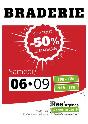 La ressourcerie Res’urgence organise une braderie exceptionnelle samedi 6 septembre à Scey-sur-Saône. Tout le magasin sera à -50 %* (*hors articles point rouge) : mobilier, vaisselle, électroménager, jouets, vêtements… L’occasion de faire de bonnes affaires pour la rentrée, tout en soutenant le réemploi !