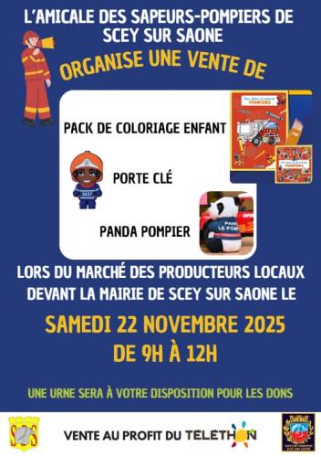 Une vente de pack coloriage enfant, peluche panda et porte clés s'effectuera samedi 22 novembre de 9h00 à 12h00 sur le marché de producteurs locaux (devant la mairie) au profit du Téléthon.